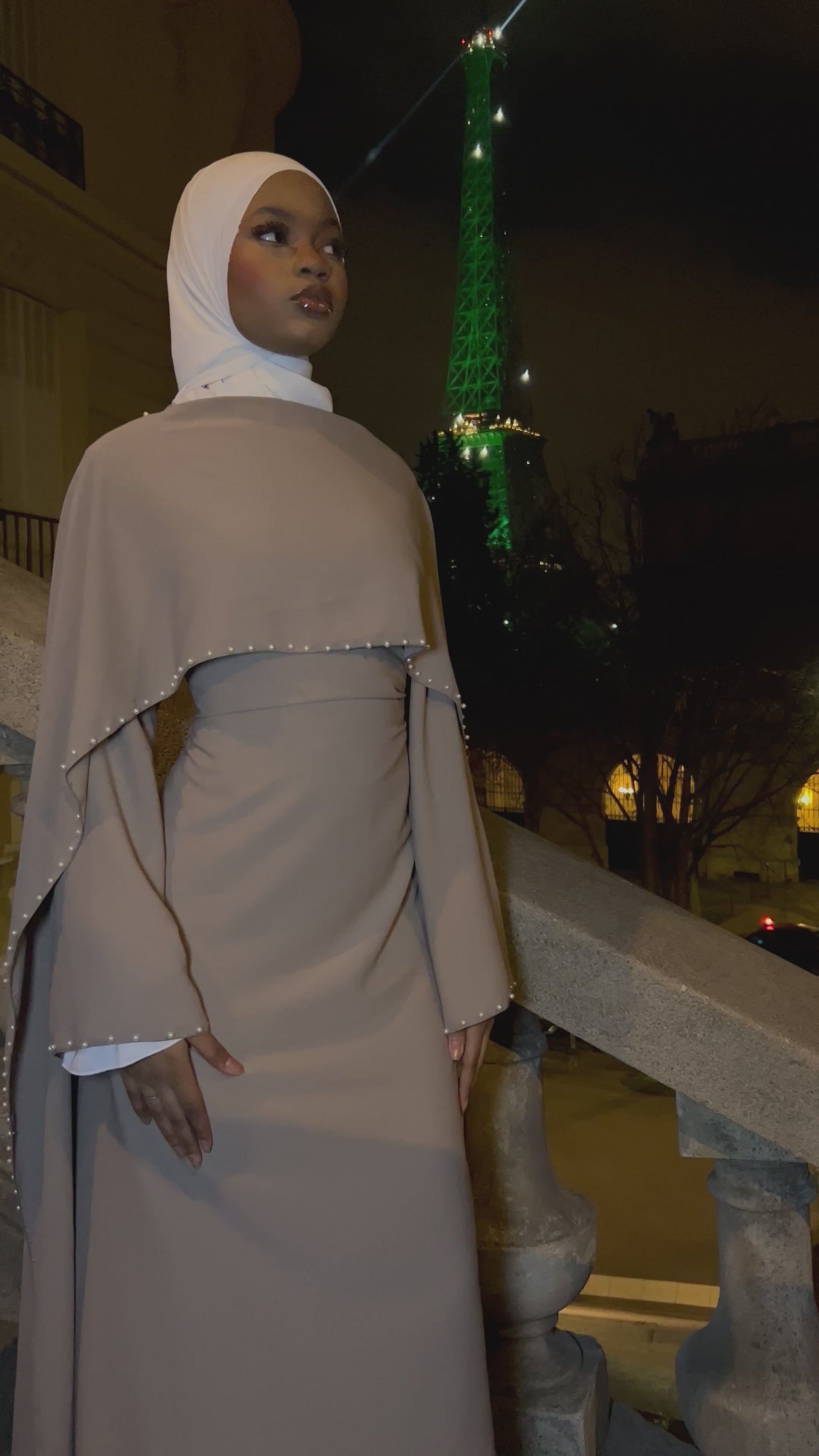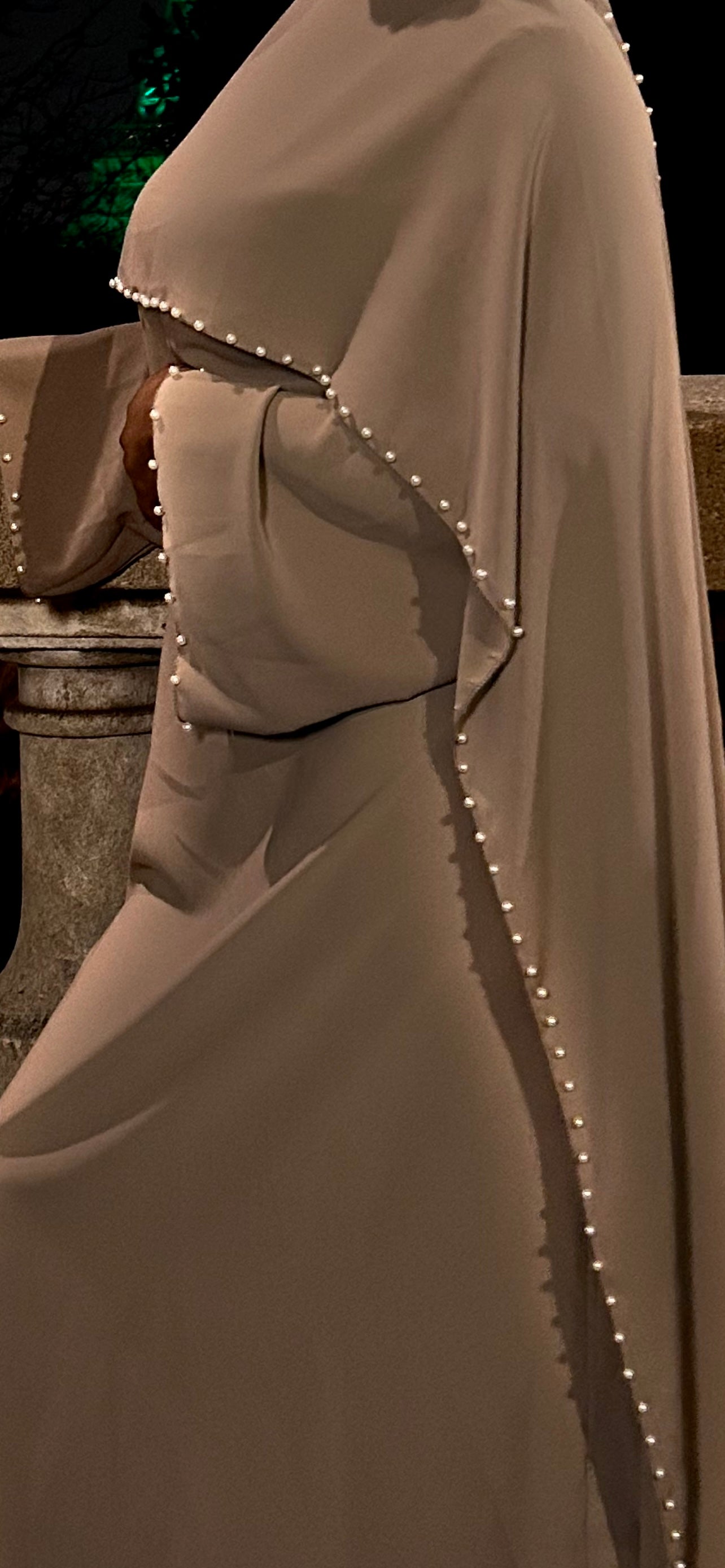 Robe beige perlée cintrée à la taille